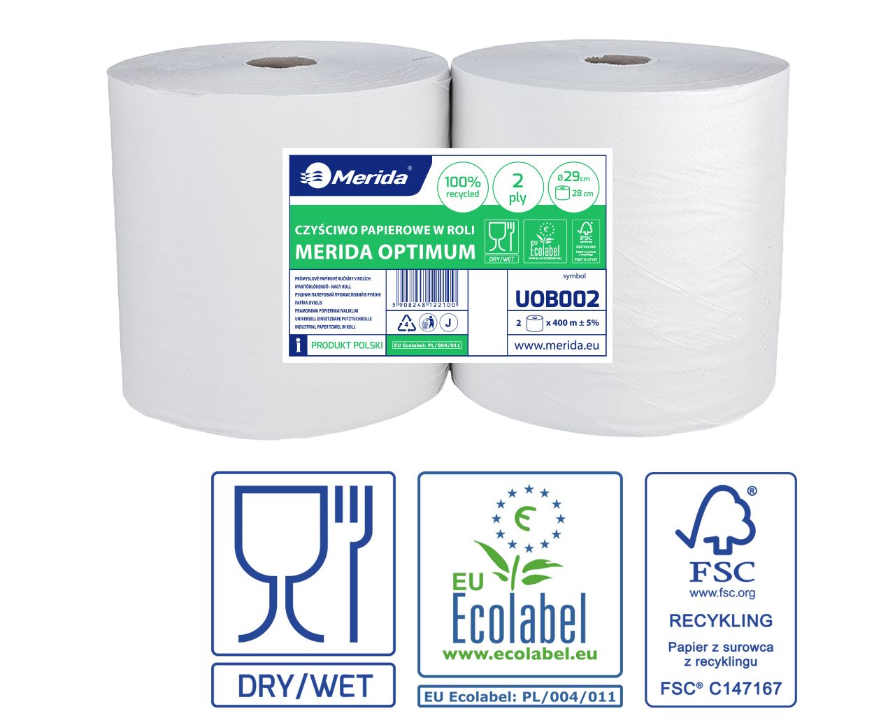 Czyściwo papierowe, MERIDA OPTIMUM 29 ECOLABEL, dwuwarstwowe, białe, długość 400 m, zgrzewka 2 sztuki