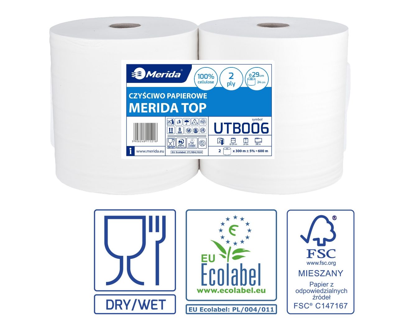 Czyściwo papierowe, MERIDA TOP 24 ECOLABEL, dwuwarstwowe, białe, długość 300 m, zgrzewka 2 sztuki