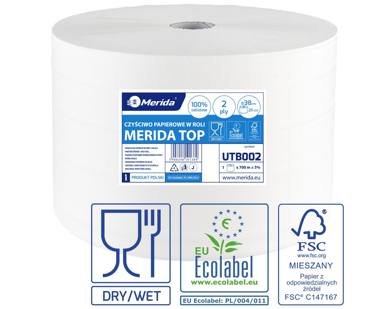 Czyściwo papierowe, MERIDA TOP 38 ECOLABEL, dwuwarstwowe, białe, długość 700 m, zgrzewka 1 sztuka