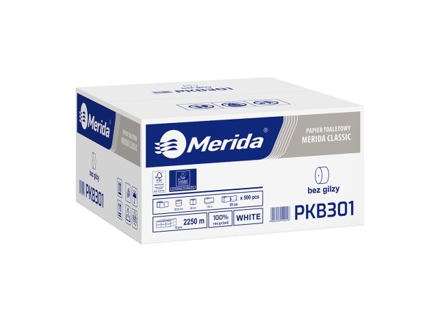 Papier toaletowy bez gilzy MERIDA CLASSIC, biały, średnica 12 cm, długość 125 m, jednowarstwowy, karton 18 szt, ECOLABEL