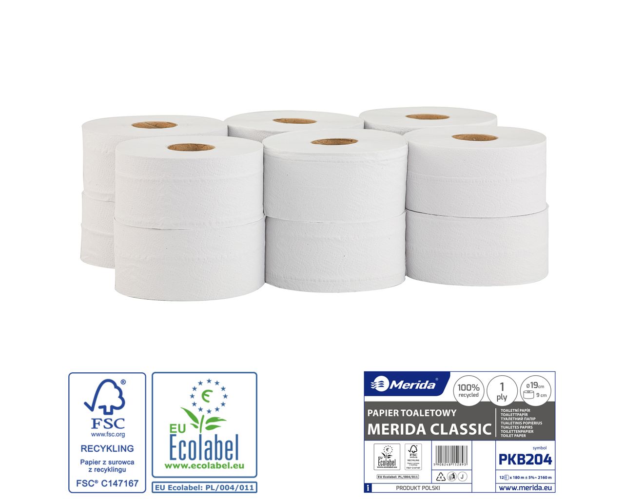 Papier toaletowy, MERIDA CLASSIC ECOLABEL, jednowarstwowy, biały, średnica 19 cm, długość 180 m, zgrzewka 12 szt.