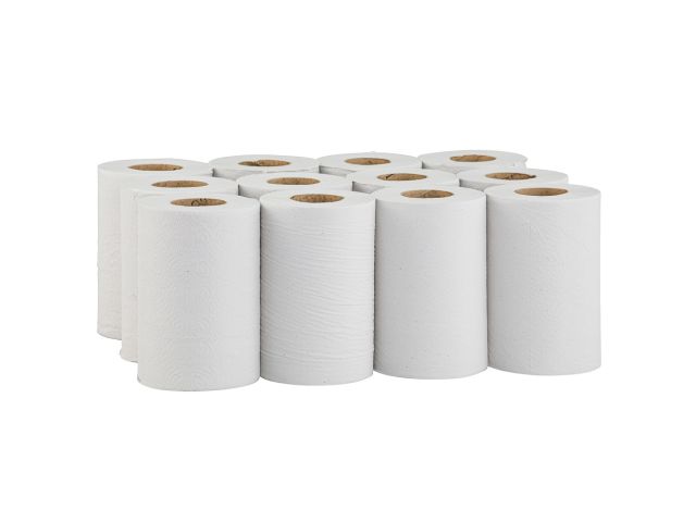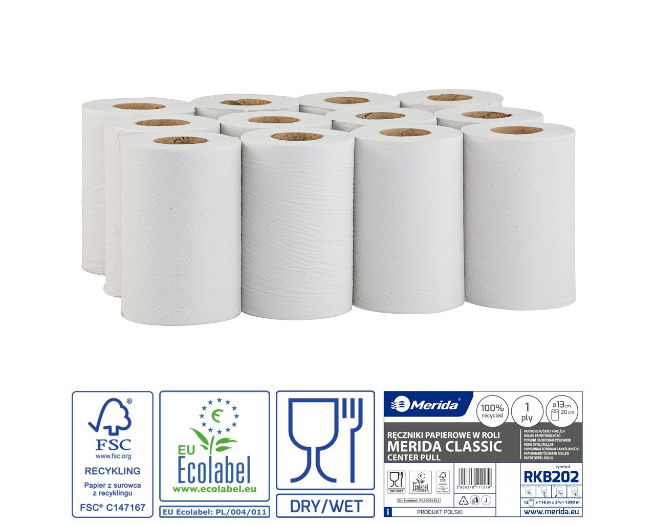 Ręczniki papierowe w roli, MERIDA CLASSIC CENTER PULL MINI ECOLABEL, jednowarstwowe, białe, średnica 13 cm, długość 116 m, zgrzewka 12 rolek