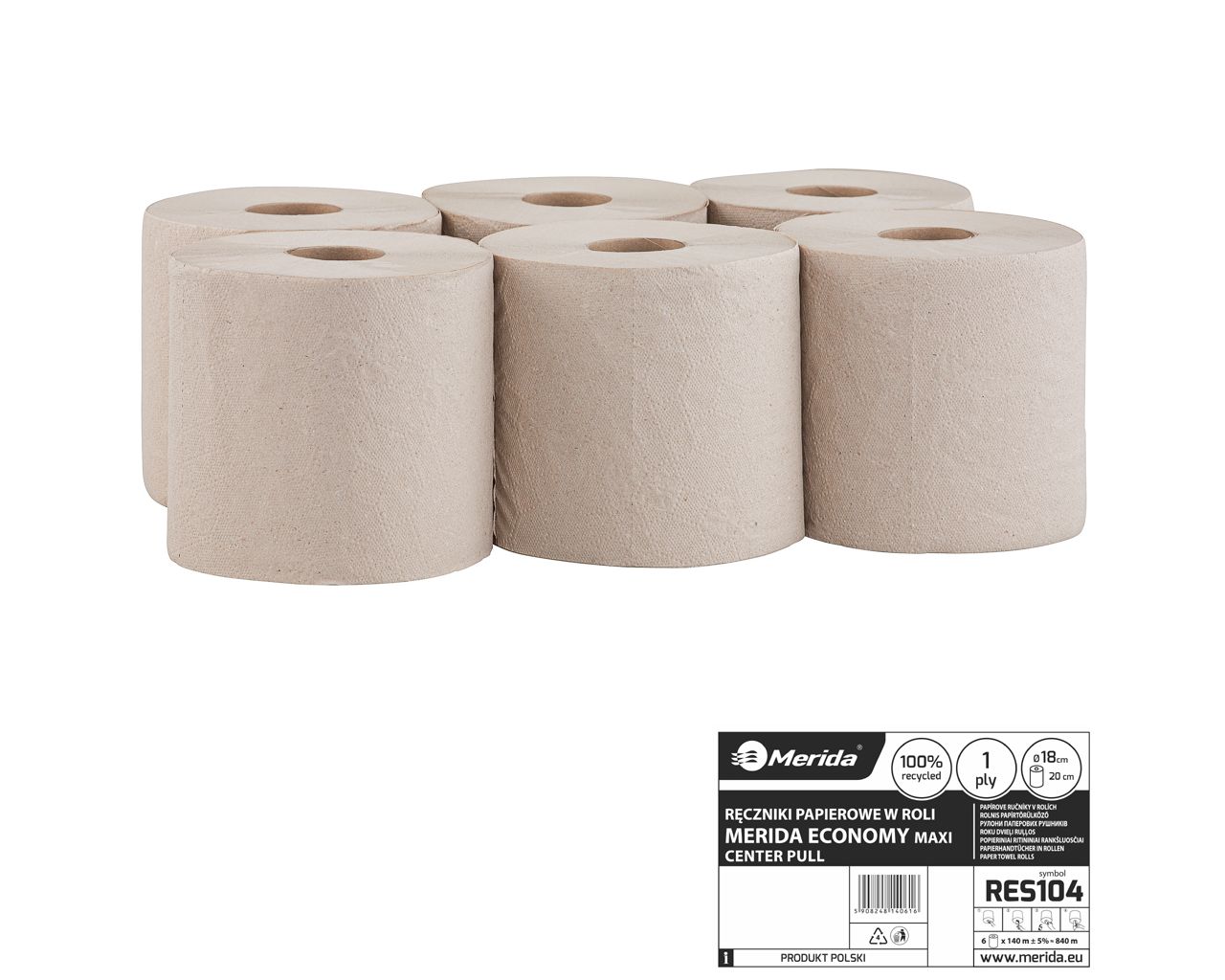 Ręczniki papierowe w roli, MERIDA ECONOMY CENTER PULL MAXI, jednowarstwowe, szare, średnica 19 cm, długość 135 m, zgrzewka 6 rolek