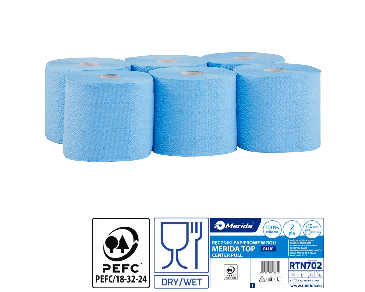 Ręczniki papierowe w roli, MERIDA TOP CENTER PULL MINI, dwuwarstwowe, niebieskie, średnica 17,2 cm, długość 122,5 m, zgrzewka 6 rolek