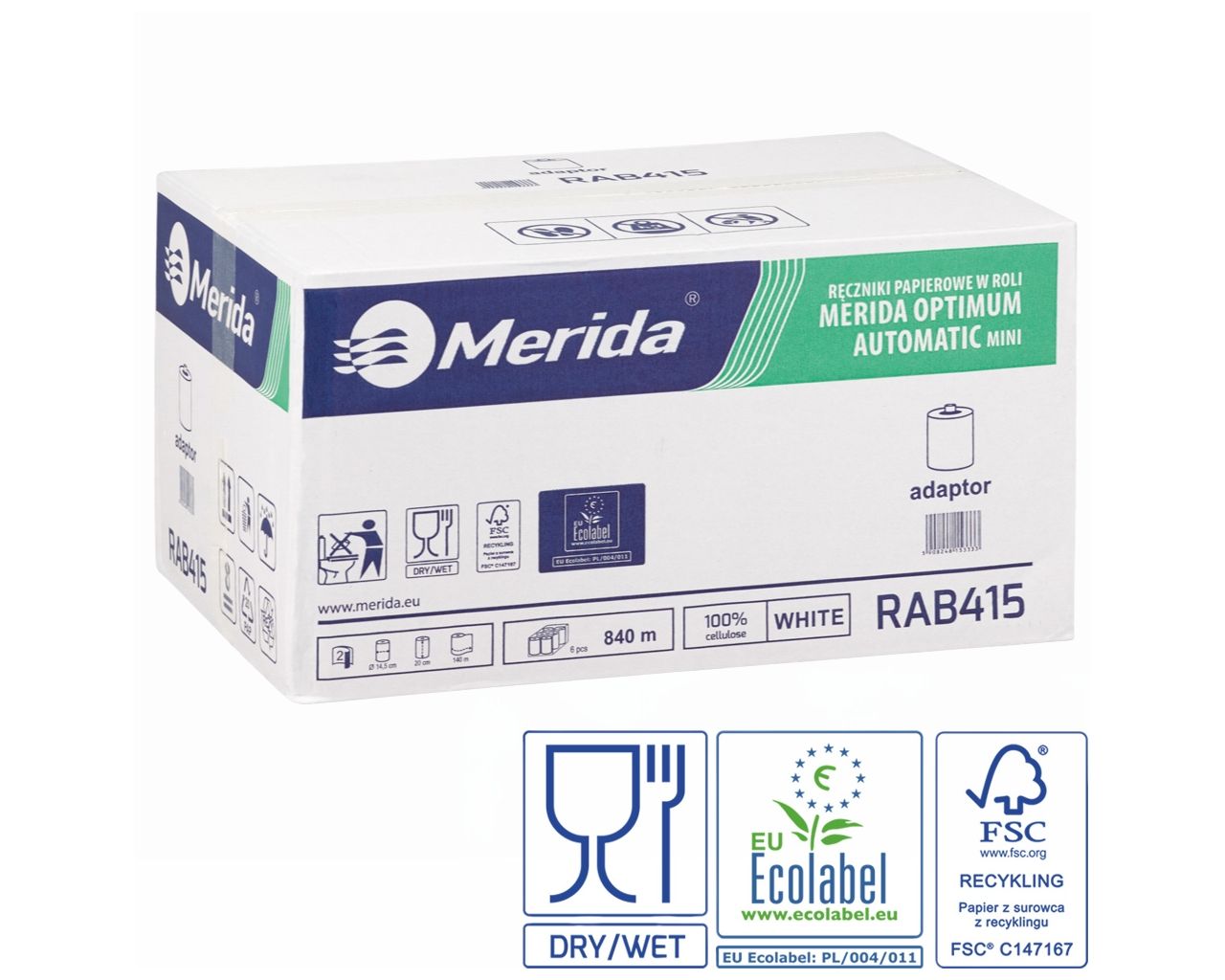Ręczniki papierowe w roli z adaptorem MERIDA OPTIMUM AUTOMATIC MINI, białe, średnica 14,5 cm, długość 140 m, dwuwarstwowe, karton 6 rolek, ECOLABEL