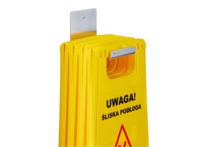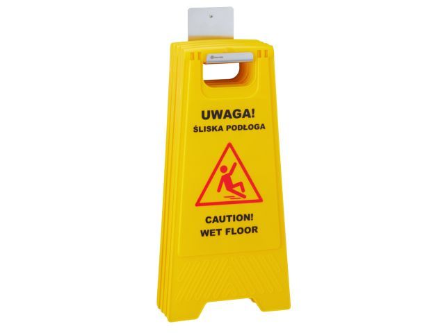Tablica ostrzegawcza "Uwaga! Śliska podłoga" niezbędna dla zapewnienia bezpieczeństwa w trakcie sprzątania posadzek w pomieszczeniach użyteczności publicznej. W kolorze żółtym, z ostrzegawczym piktogramem i napisem, ostrzegającym przed śliską podłogą. Wyposażona w uchwyt ułatwiający przenoszenie i rozkładanie. Po złożeniu zajmuje niewiele miejsca. Można także powiesić na GSM051.