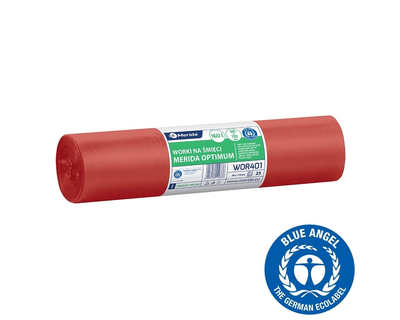 Worki na odpady medyczne 160 l, MERIDA OPTIMUM BLUE ANGEL, czerwone, 90x110, rolka 25 szt.