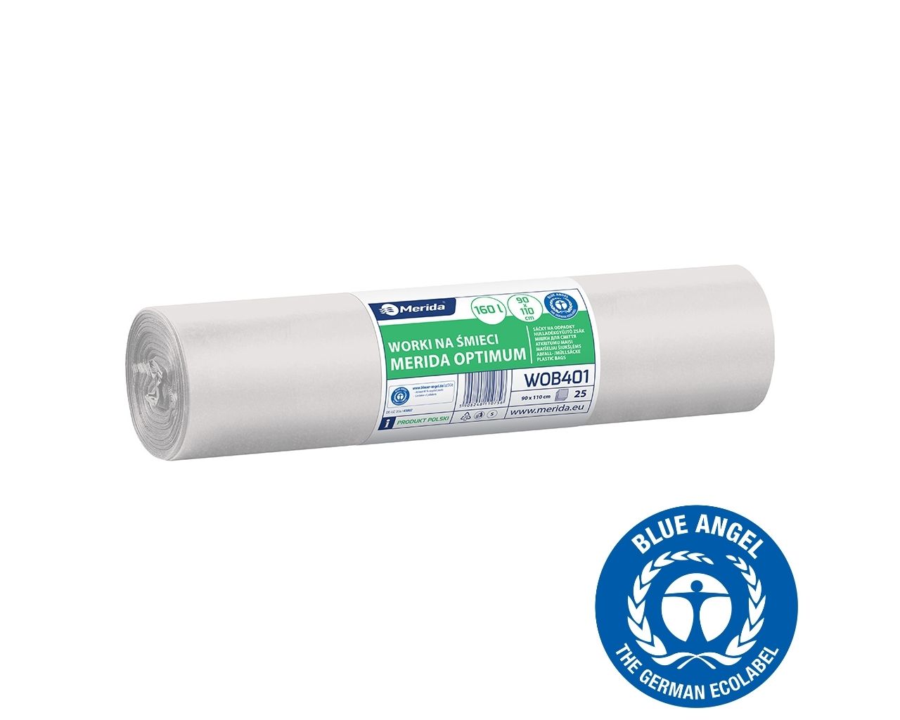Worki na śmieci 160 l, MERIDA OPTIMUM BLUE ANGEL, białe, 90x110 cm, rolka 25 szt.