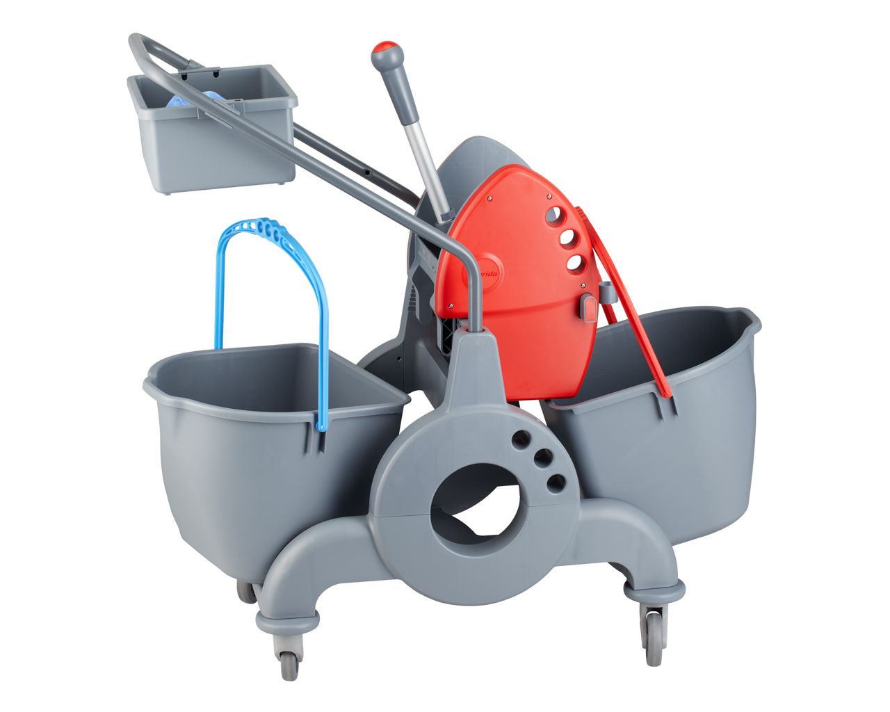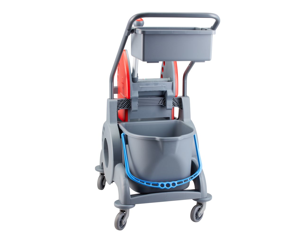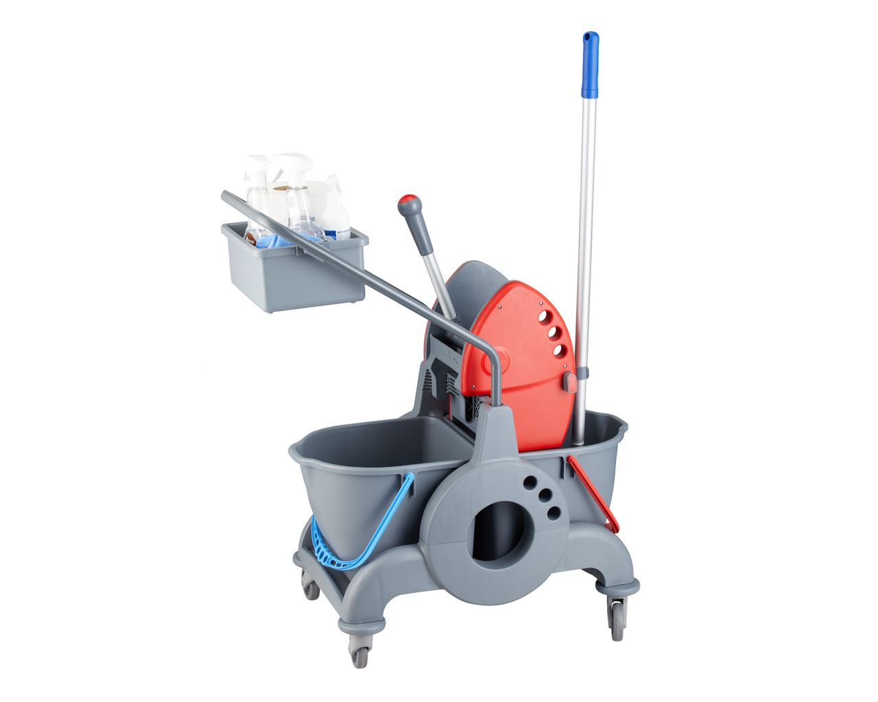 Wózek serwisowy do sprzątania, dwuwiadrowy, 2× wiadro 15 l, kuweta 8 l, czerwona prasa