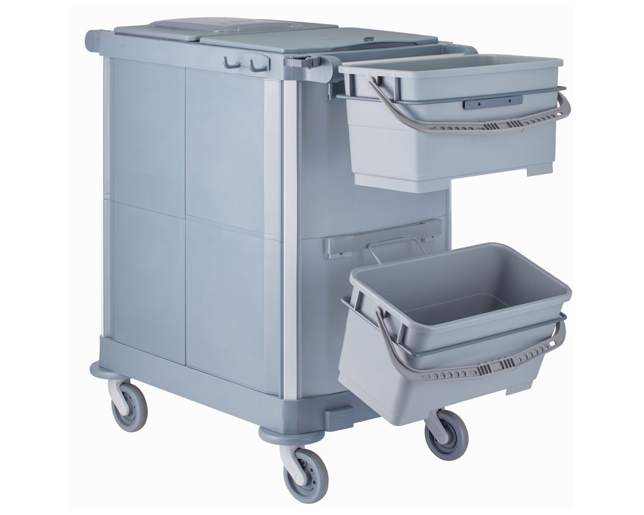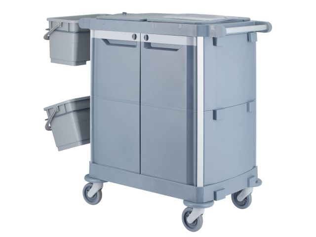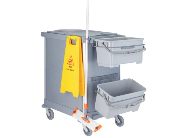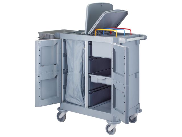- wózek może być całkowicie zamykany za pomocą drzwi (zamykanych na klucz) i pokryw, co zapewnia maksymalne bezpieczeństwo i higienę, ukrywając detergenty i narzędzia