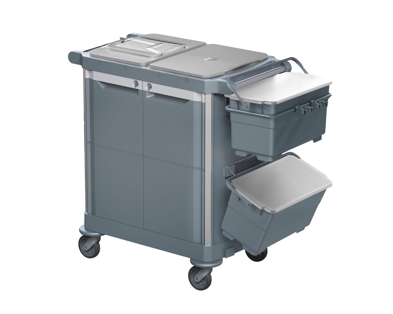 - wózek może być całkowicie zamykany za pomocą drzwi (zamykanych na klucz) i pokryw, co zapewnia maksymalne bezpieczeństwo i higienę, ukrywając detergenty i narzędzia