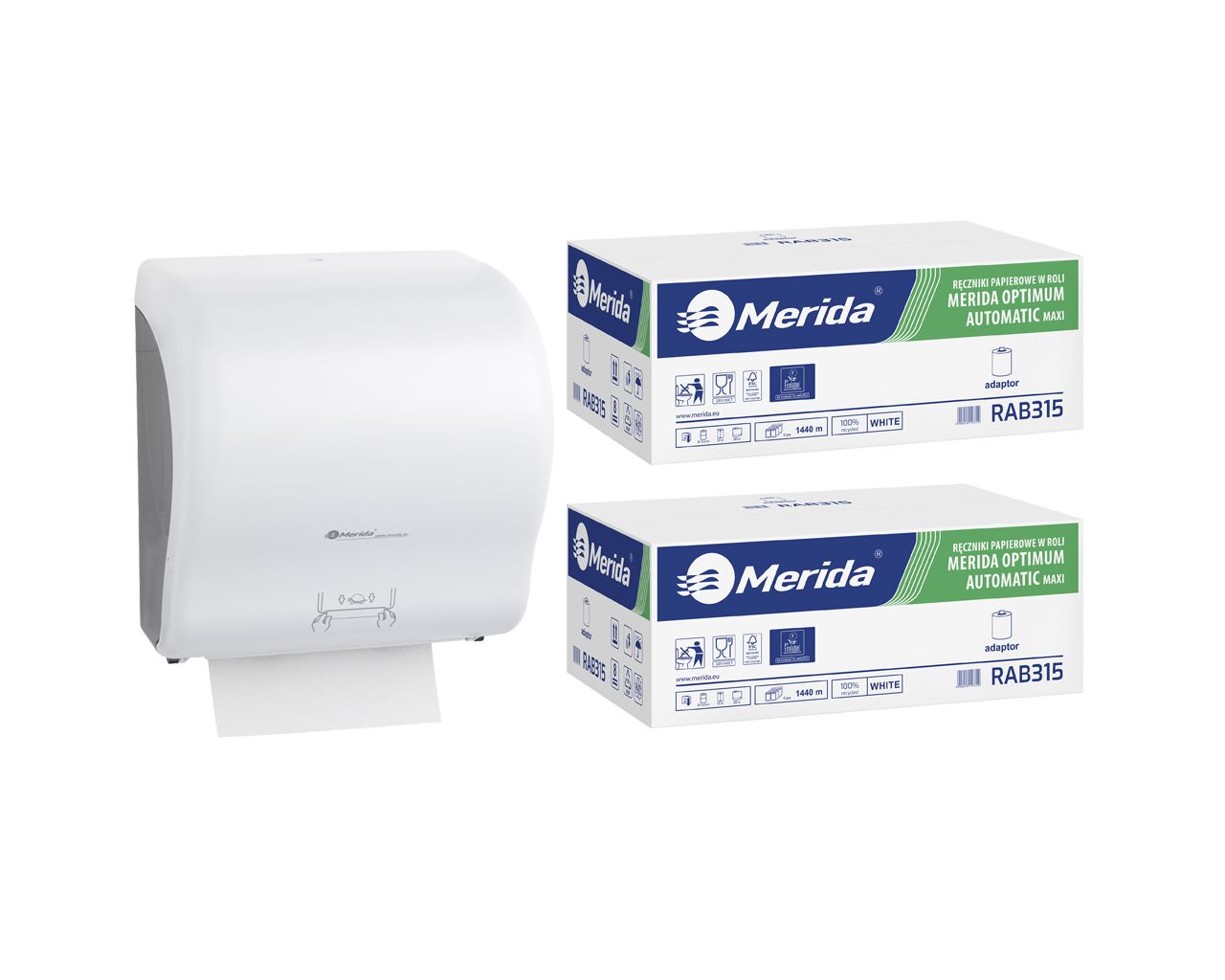 Mechaniczny podajnik ręczników, MERIDA LUX CUT za 125 zł netto przy zakupie 2 kartonów ręczników MERIDA OPTIMUM AUTOMATIC MAXI ECOLABEL RAB315 (12 x 240 m = 2 880 m, 11 292 listki)