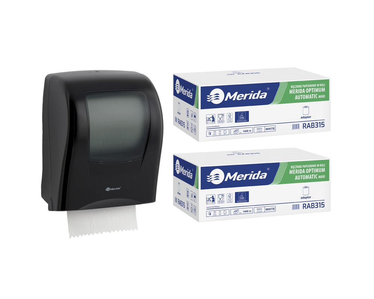 Mechaniczny podajnik ręczników, MERIDA ONE czarny za 125 zł netto przy zakupie 2 kartonów ręczników MERIDA OPTIMUM AUTOMATIC MAXI ECOLABEL RAB315 (12 x 240 m = 2 880 m, 11 292 listki)