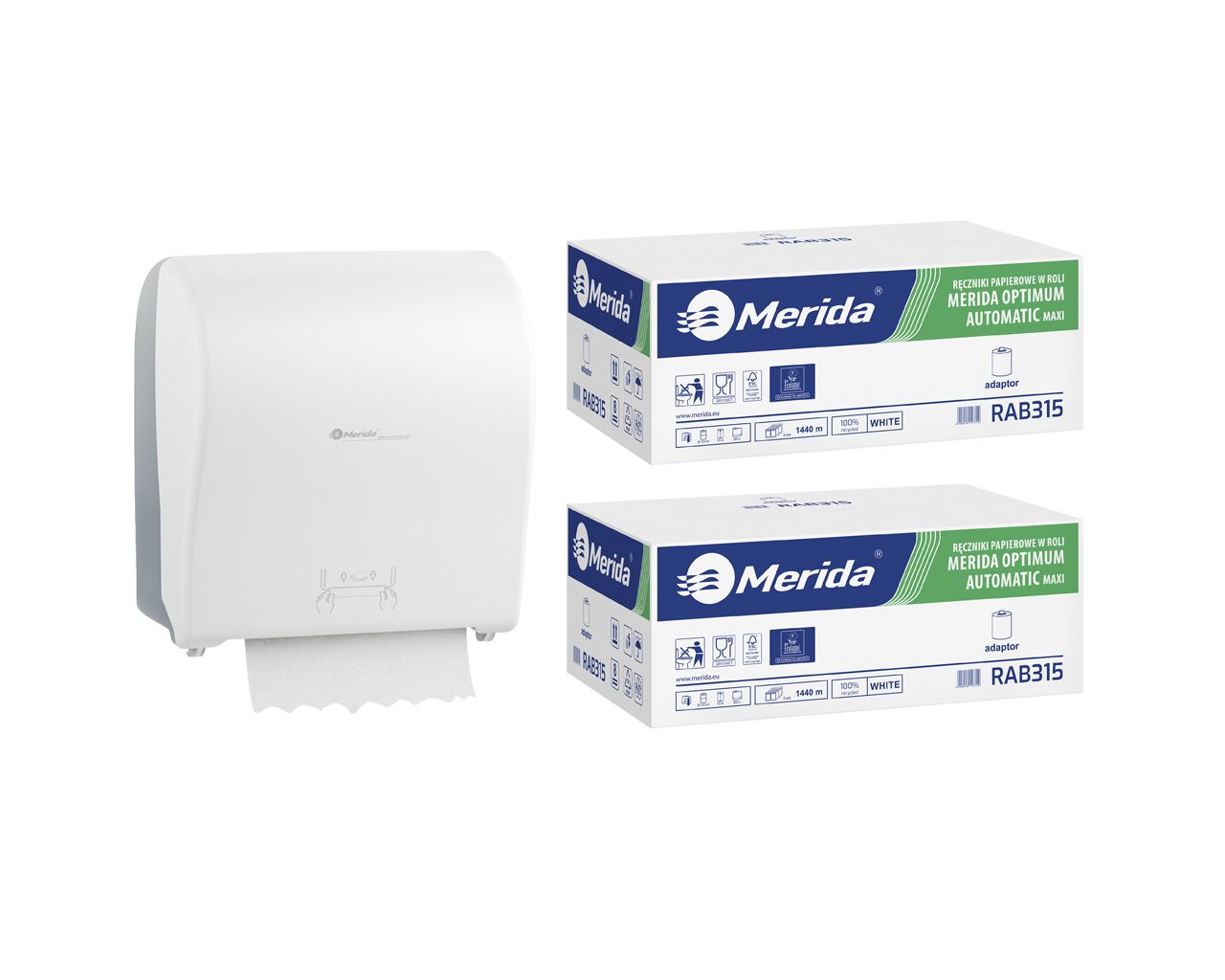 Mechaniczny podajnik ręczników, MERIDA SOLID CUT za 100 zł netto przy zakupie 2 kartonów ręczników MERIDA OPTIMUM AUTOMATIC MAXI ECOLABEL RAB315 (12 x 240 m = 2 880 m, 11 292 listki)